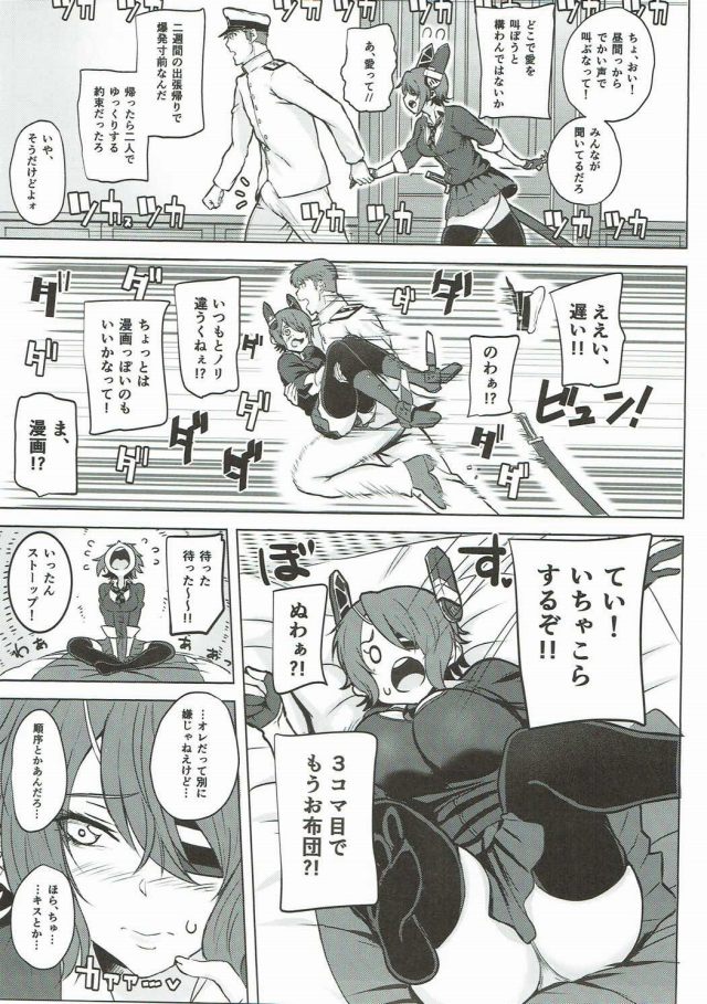 《艦隊これくしょん エロ同人誌》ぬわぁ!?3コマ目でもうお布団!? やる気マックスの提督に天龍も驚いています!まぁ出張で2週間ご無沙汰でしたからねぇ♪