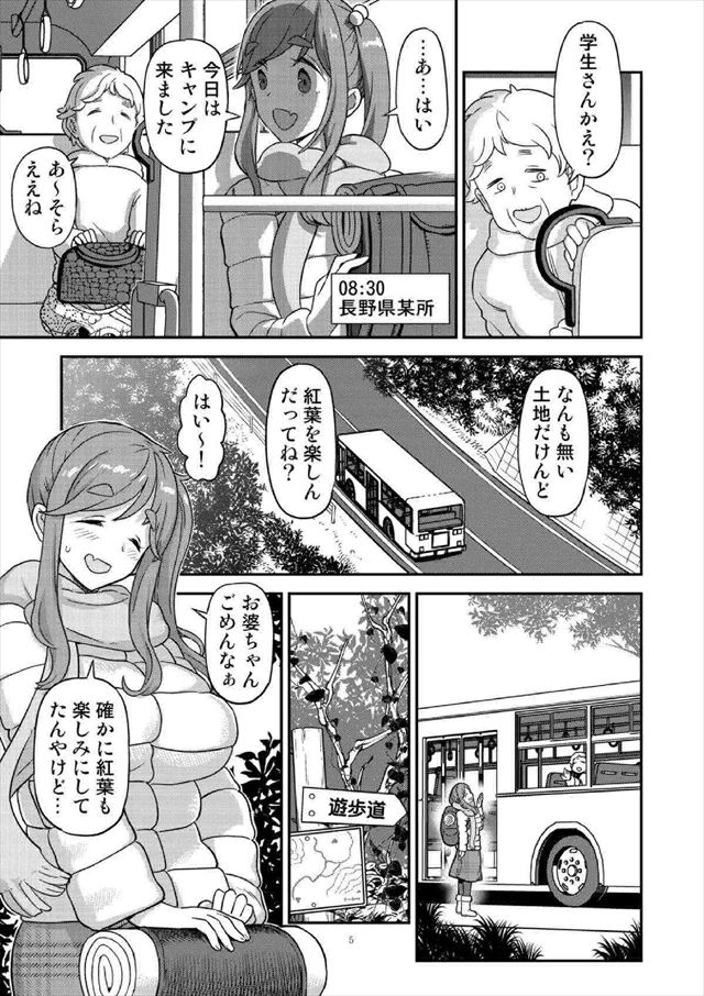 《ゆるキャン△》山の遊歩道で野外露出や全裸身バレ動画を撮影する変態なあおいちゃんが怖そうなお兄ちゃんに脅されて凌辱されちゃう同人誌だと思ったら最後は1枚上手でしたww